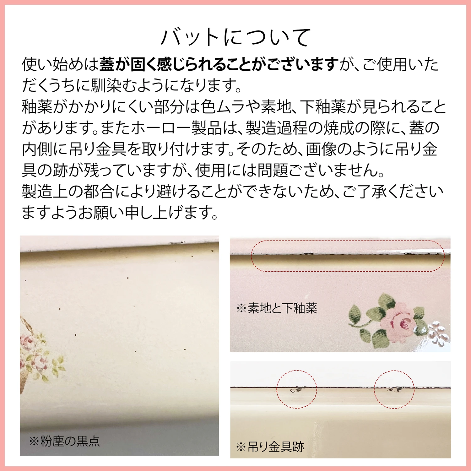 - ・ホーローを焼く時に吊るすため、吊るした跡が残る場合があります。
