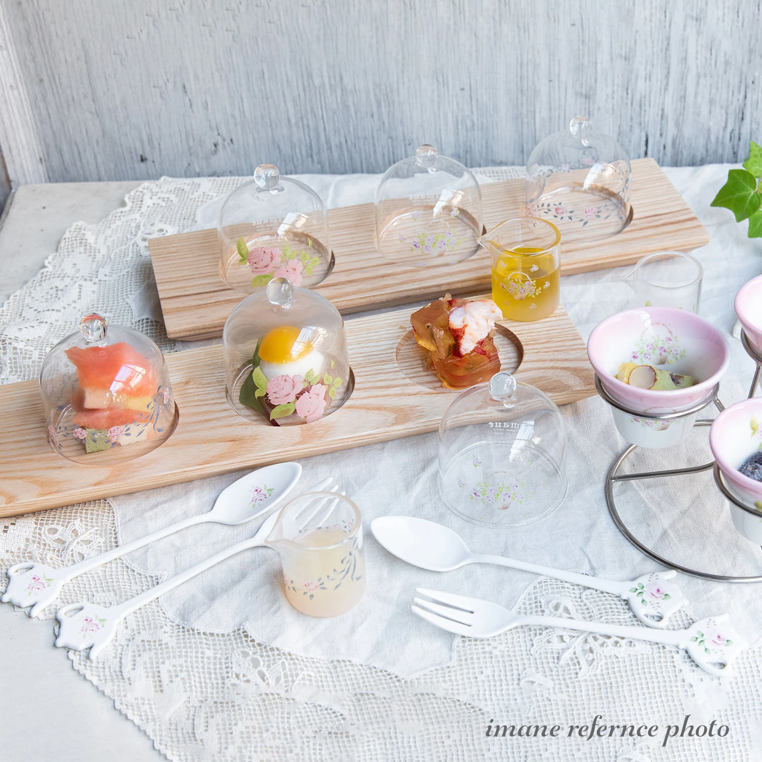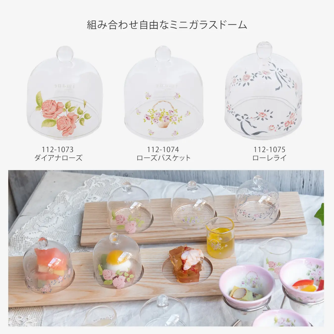 魅せる演出を叶える ガラスドームの器 ~フィンガーフードやアミューズ、プティフールなど、一口サイズの繊細な料理を、美しく盛り付けれます。ドームを開ける瞬間のわくわく感は格別の喜びをお楽しみいただけます。パーティーや特別な日のテーブルコーディネートはもちろん、日々の食卓でのお菓子やパンのディスプレイにも最適です。このガラスドームで、あなたの作る小さな料理を「食の宝石」へと昇華させてみませんか。